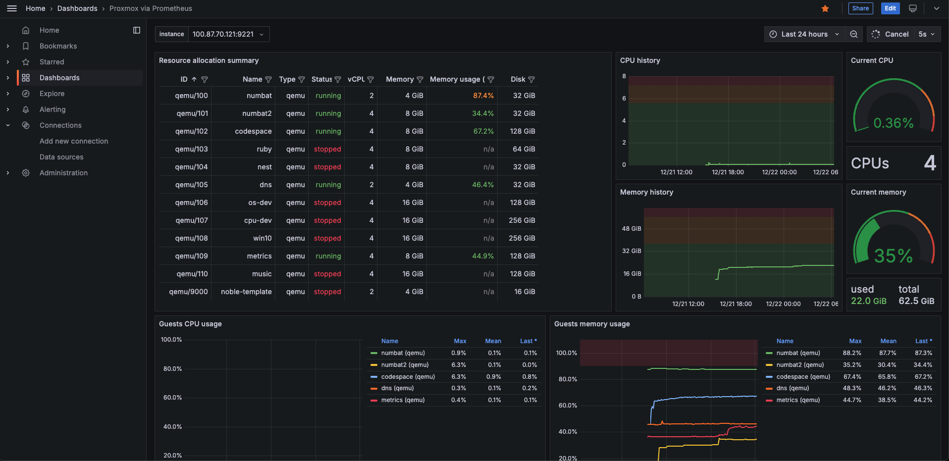 昨年から研究室に置いているマシンでProxmox VEを動かしているのだが、先日実家にミニPC(N100, 16GB, 512GB)に設置してProxmox VEを新たに導入した。もともとProxmox VEのWebインターフェースは普段使いでどのくらいCPUやメモリを使用しているかを観察する程度では十分だが複数サーバの健康状態を常に監視するには不十分であり、時系列データを保存しているわけではないのであくまでその時点でのデータしか見れず過去の状態を見ることはできないという点が不便なので、以前から監視ツールであるPrometheusを導入したいと考えていた。