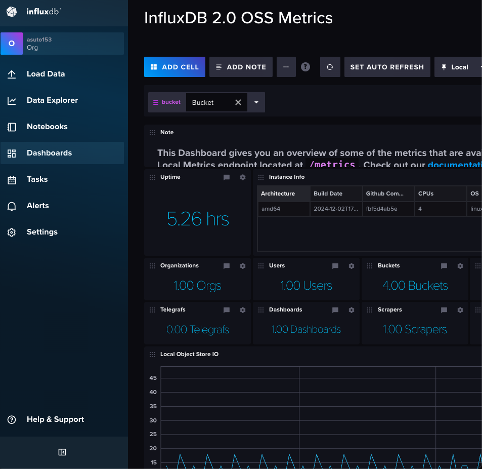 その後、CLIかLoadDataタブののBucketsからPrometheus用のバケットを作成したら、TelegrafからPrometheusのデータを書き込む準備が完了する。