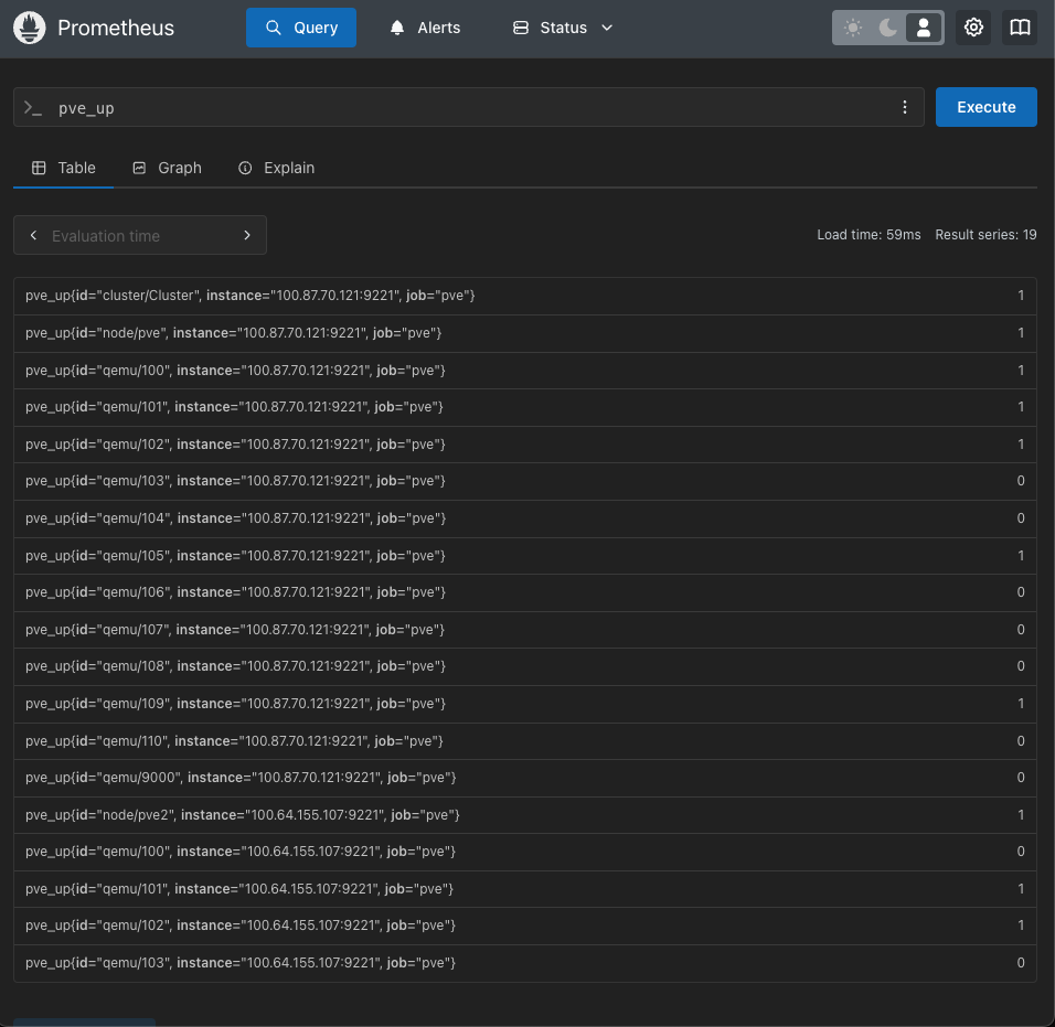 http://<ProxmoxホストのIPアドレス>/pve?target=<ProxmoxホストのIPアドレス>にアクセスしてみて、以下のような内容が表示されたらExporterがおそらく正常に機能している。私の場合は、先ほどの手順にあった